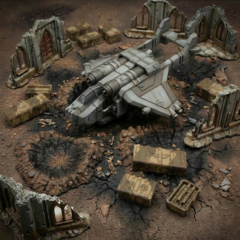 This set represents a complete extraction scene, designed to drop directly onto the tabletop as an objective zone, impact site, or mission focal point. Everything is scaled and composed to work together as a single, unified moment on the battlefield.