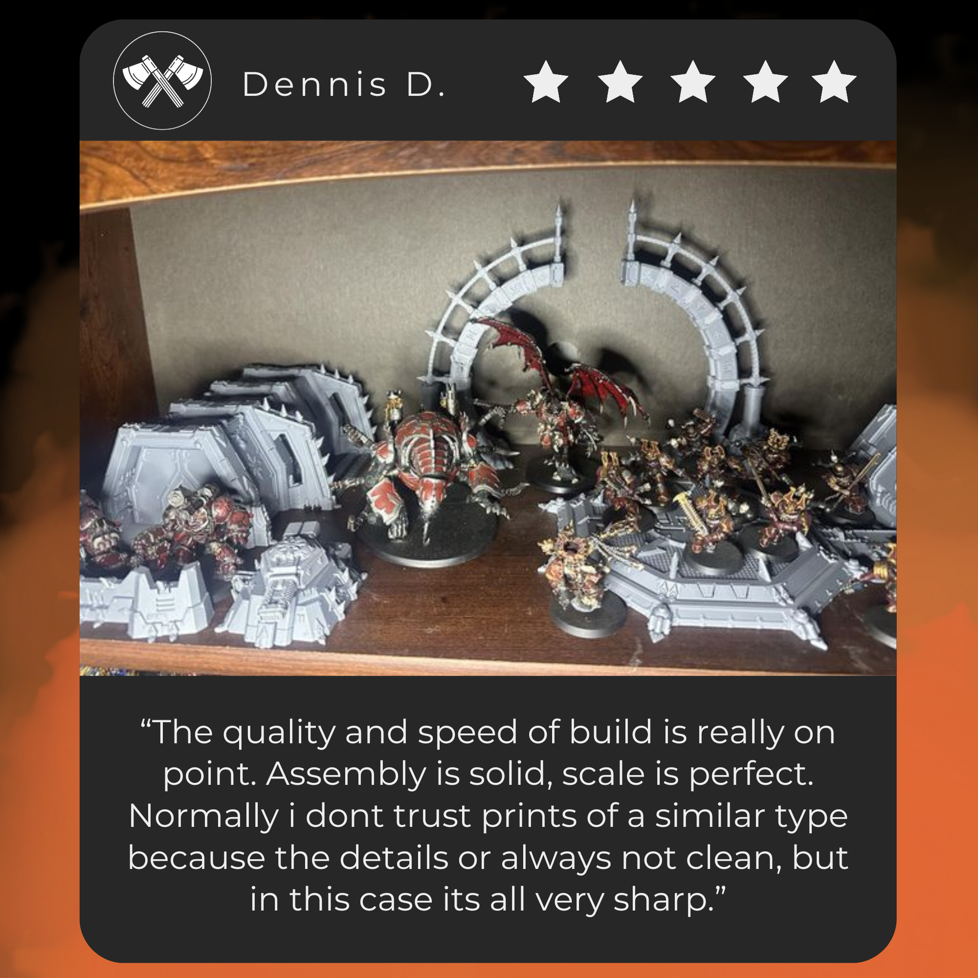 Every piece is printed on calibrated machines with premium PLA filament. We inspect each item before shipping to ensure your terrain is ready for the table (or the paint station).